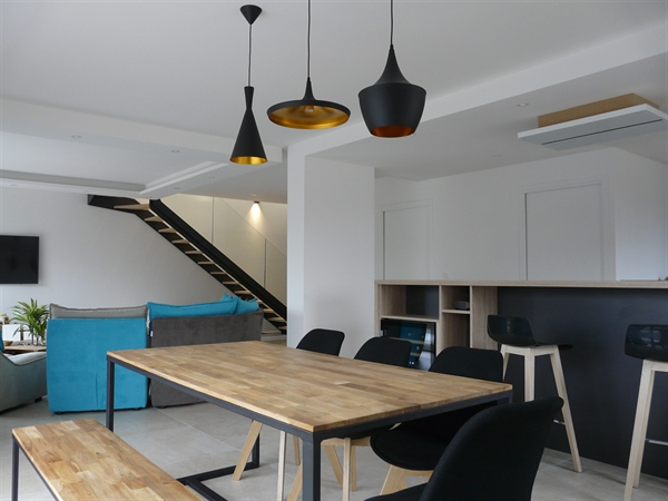 Cet appartement de 170 m² est distribué en duplex et s'ouvre sur une terrasse.
